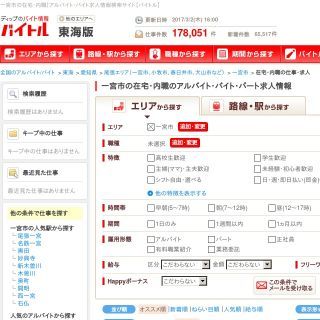 「アルバイトEX」は20社以上の求人サイトをまとめて検索できて便利です。介護、塾講師、薬剤師、工場など専門的な求人を扱っているサイトも含まれるので、さまざまなお仕事が見つかりますよ。一宮市ではセラピスト、軽配送、ヤクルトスタッフ、電話による保健指導、塾講師、家庭教師など20件以上のお仕事が紹介されています。「アルバイトEX」から応募してお仕事が決まり、就業して条件を満たせばお祝い金がもらえるキャンペーンをおこなっていることがありますよ。