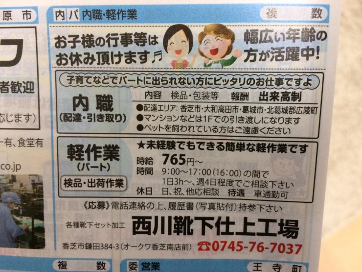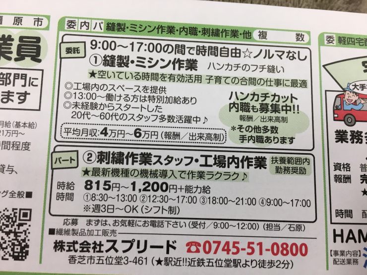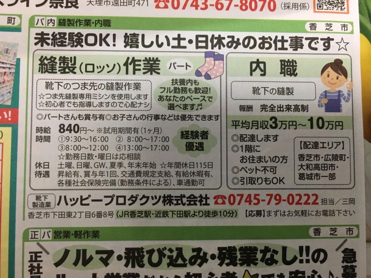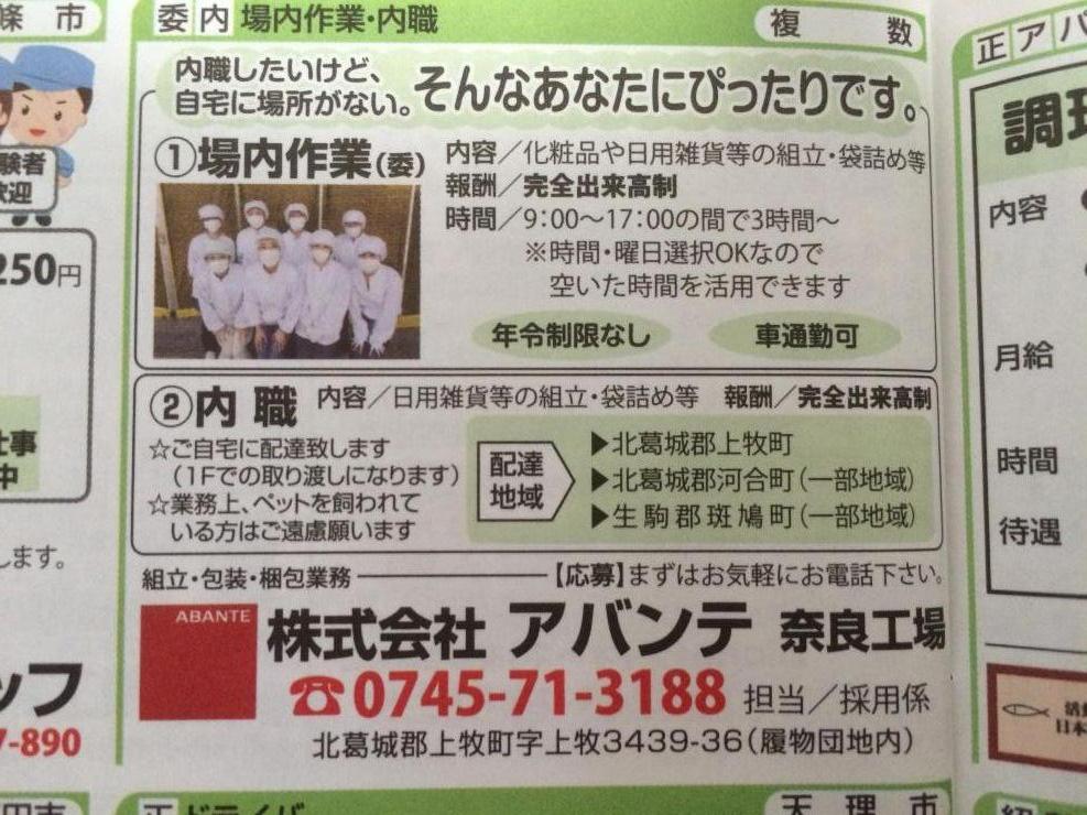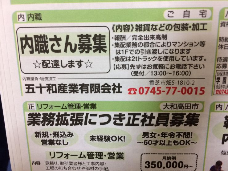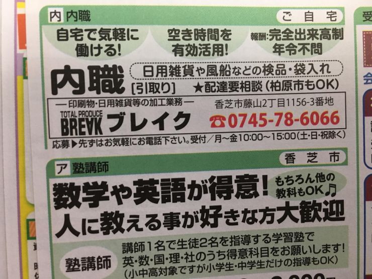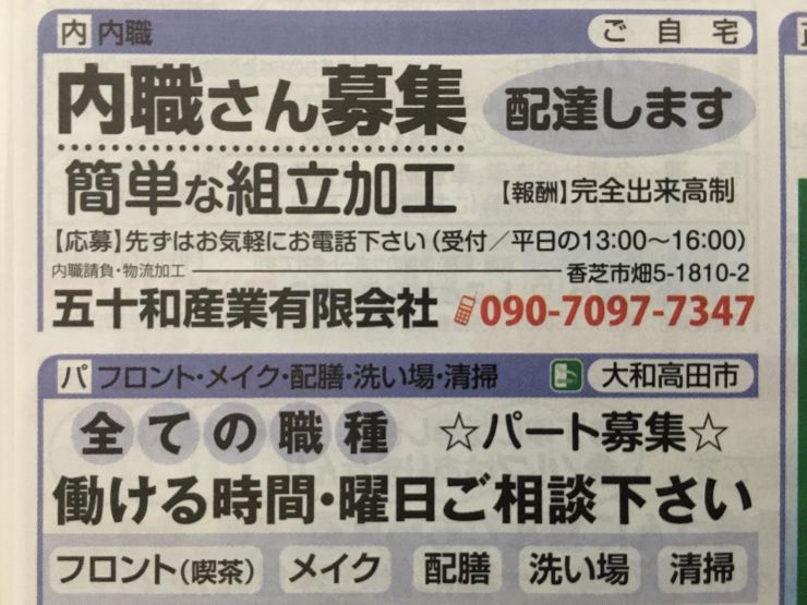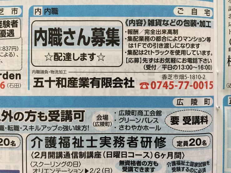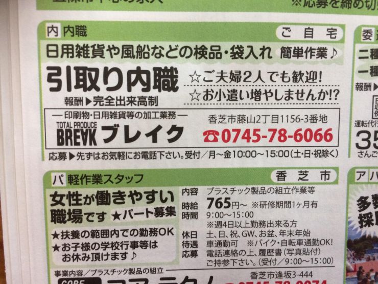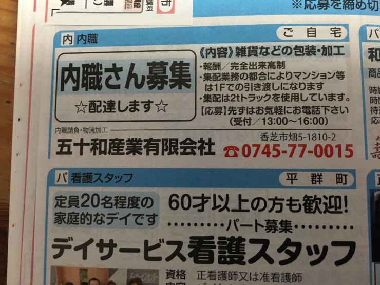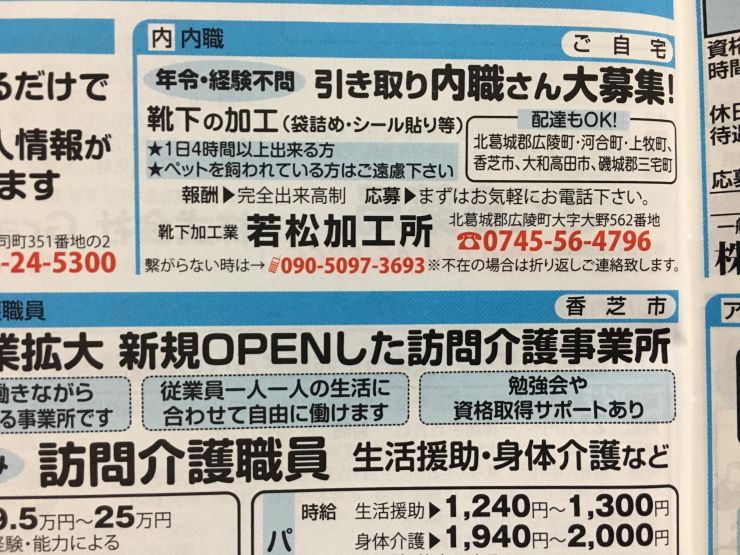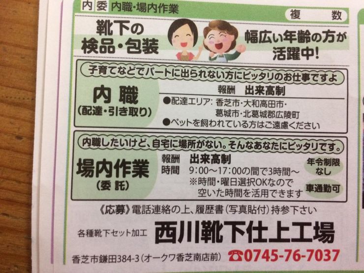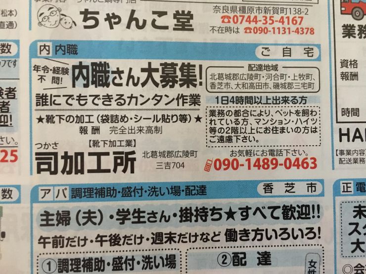 ユーザから投稿してもらった香芝市の内職チラシ情報を公開しています。