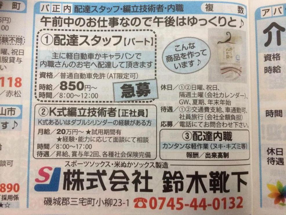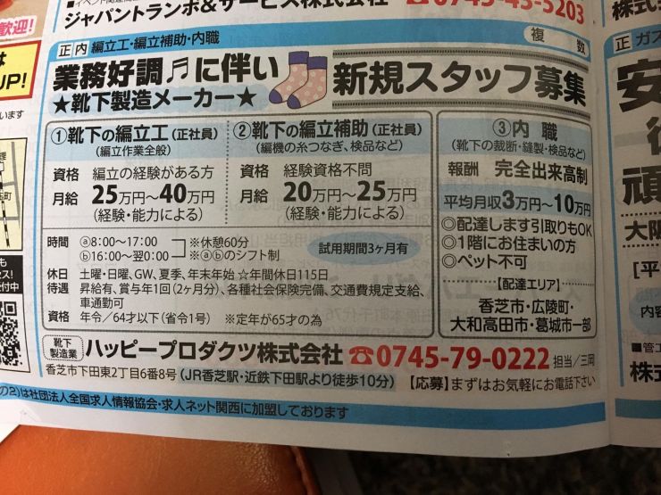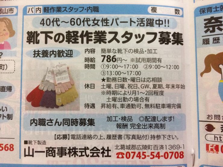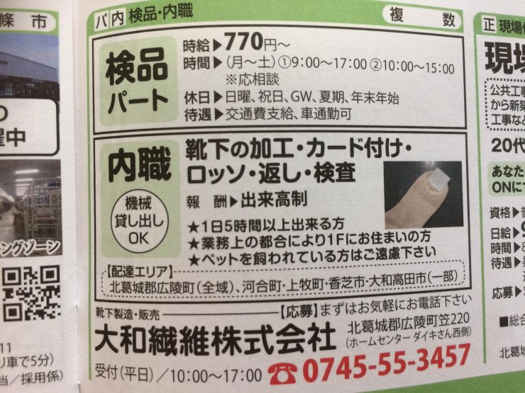 靴下製造メーカーの靴下の検品・傷見などの、内職の求人です。報酬は完全出来高制です。会社からの配達があります。