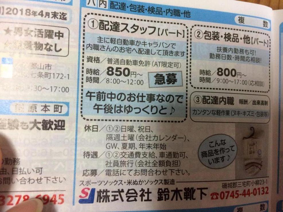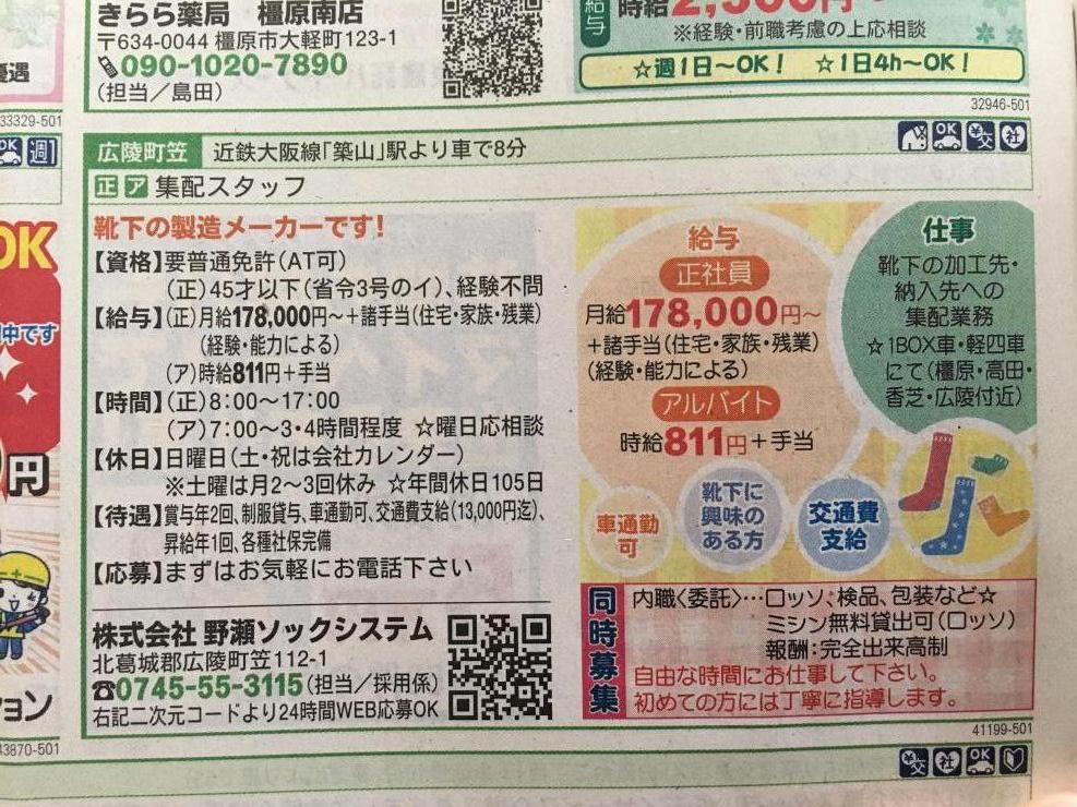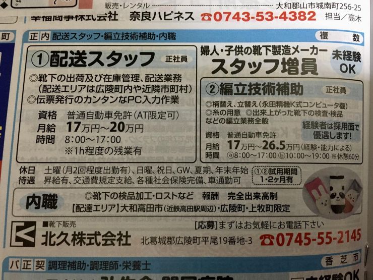 配達可能地域が広陵町、河合町、上牧町、大和高田と田原本(一部)となりますので、そちらにお住まいの方にオススメです。報酬は完全出来高制で、月収例は15,000~20,000円となっています。まずはお電話を。