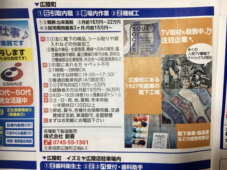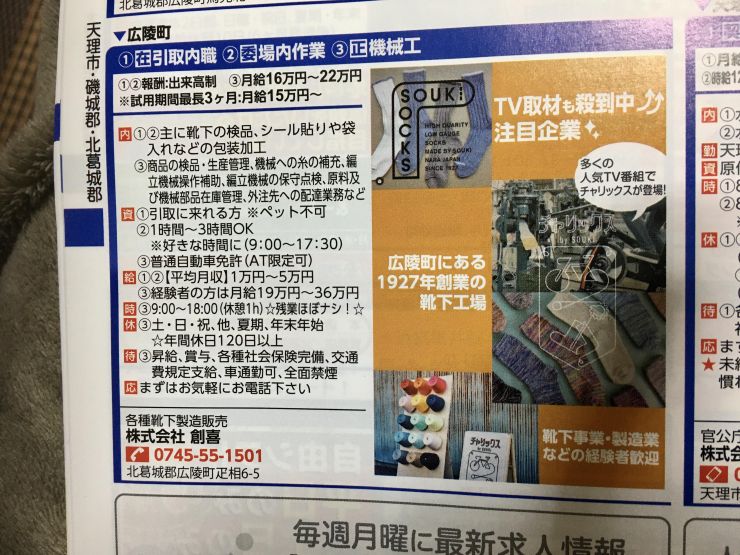 奈良県北葛城郡広陵町疋相にある、各種靴下製造販売を行っている会社です。主に厚みがありざっくりとした編目が特徴のローゲージソックスや、くつしたの技術を使ったアームカバーなどを得意としています。1927年創業です。
