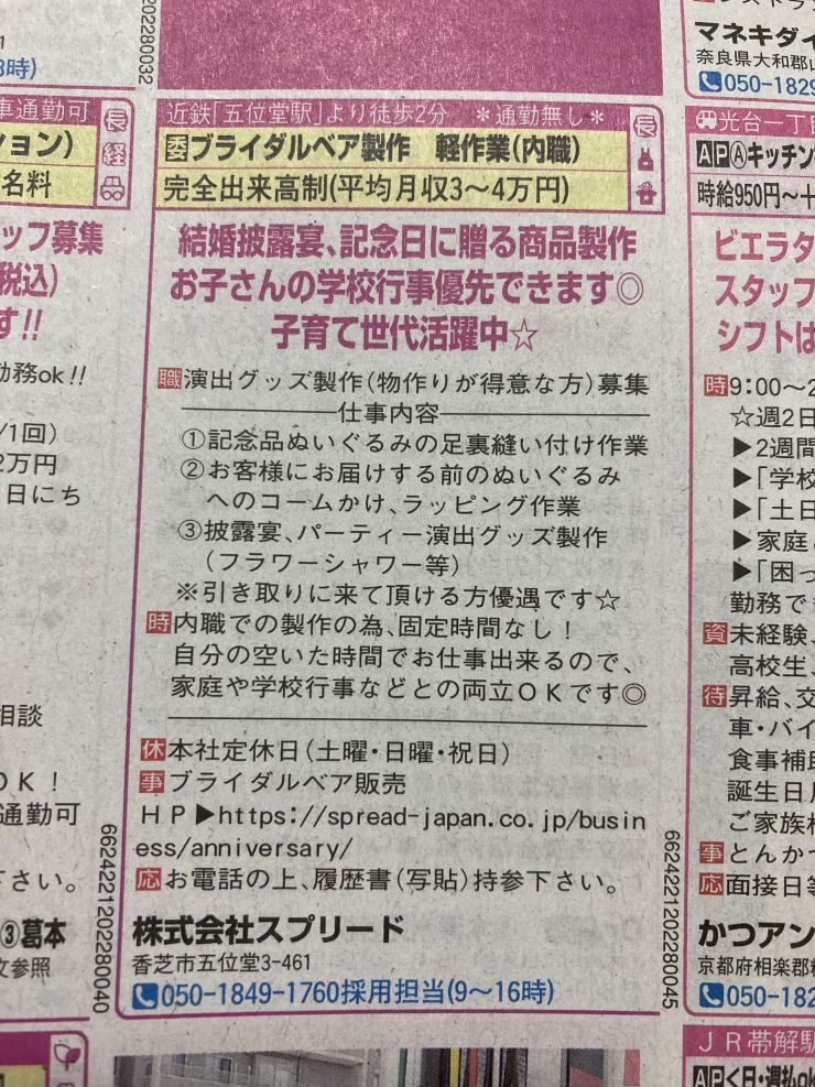 仕事内容は記念品ぬいぐるみの足裏縫い付け作業、届ける前のぬいぐるみへのコームかけ・ラッピング作業、披露宴・パーティー演出グッズ製作(フラワーシャワー等)となります。引き取り可能な方には優遇があります。