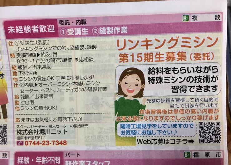 オーバーミシン・本縫いミシンでのセーター、ベスト、カーディガンの縫製作業のお仕事ですので、こういった経験がある方にオススメ出来ます。報酬は出来高制となります。興味を持たれた方は、まずはお気軽にお電話を。