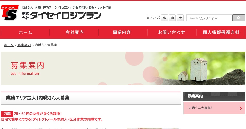 公式サイトへ「株式会社 タイセイロジプラン」の内職について、ホームページの記載内容から、オススメできそうか(安心できそうか)を在宅ワークガイド・スタッフが独自にチェックしました。(2015年12月28日チェック)