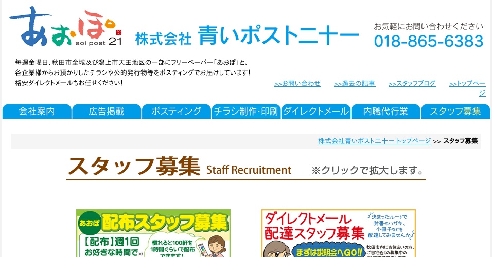 秋田市などでポスティングやフリーペーパー「あおぽ」の制作・発行、ダイレクトメールの配達などを行っている会社です。仕事内容は在宅ではありませんが封書やはがき、小冊子などの配達です。秋田市内にお住まいの方を対象に募集しています。配布エリアは自宅周辺となっているためはじめやすい仕事になっています。検討されている方は説明会も開催されているのできちんと話を聞いたうえで仕事をするかどうか判断することができます。
