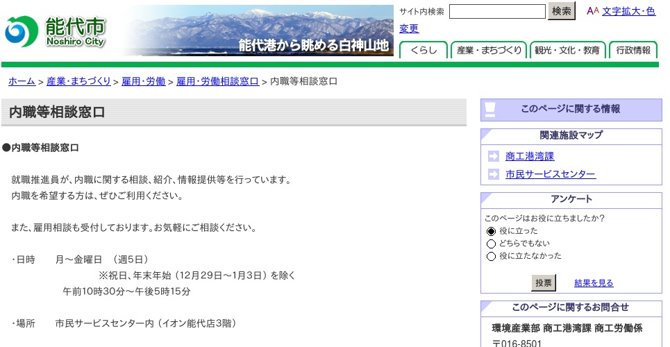 能代市の公式サイトになります。能代市では市民サービスセンター内に内職に関する情報提供や相談受付などを行っている窓口を開設しています。また、ホームページにも求人情報が掲載されているので便利なサイトになっていると思います。