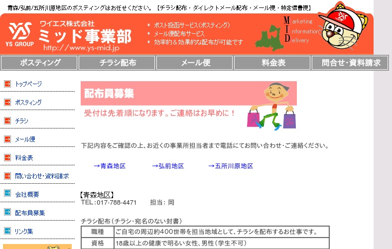 青森市、弘前市、五所川原市に営業所のあるチラシ配布やメール便配布サービスを行っている会社です。青森地区、浪岡地区での仕事になります。チラシ配布とメール便配布があるようで勤務日や勤務地も少し異なっています。詳しいことは電話にて問い合わせができるので確認してください。