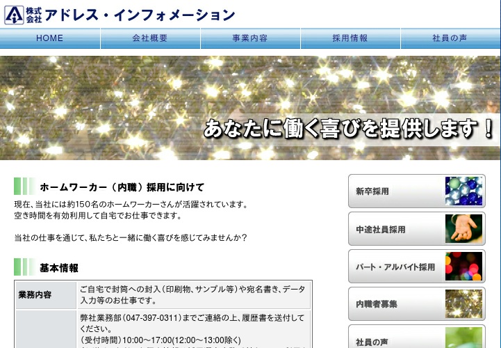 公式サイトへ「株式会社 アドレス・インフォメーション」の内職について、ホームページの記載内容から、オススメできそうか(安心できそうか)を在宅ワークガイド・スタッフが独自にチェックしました。(2016年1月9日チェック)