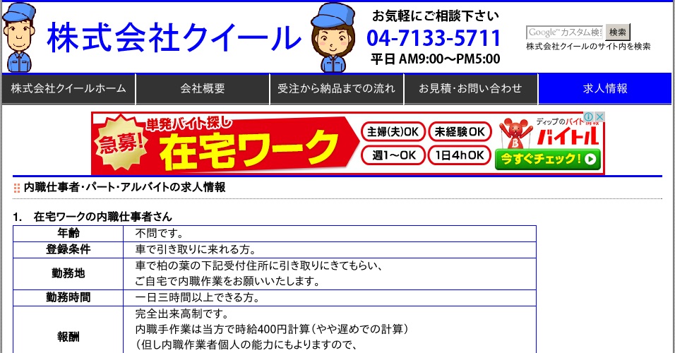 公式サイトへ「株式会社クイール」の内職について、ホームページの記載内容から、オススメできそうか(安心できそうか)を在宅ワークガイド・スタッフが独自にチェックしました。(2016年1月9日チェック)