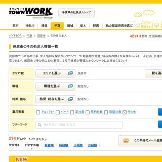 ページのあちこちにキャラクターのジョブーブがいて可愛らしい「タウンワーク」でも、しっかりお仕事が探せますよ。茂原市では雇用形態のその他にチェックを入れて検索すると数多く見つかります。セラピスト、子ども向け英会話塾のインストラクター、ヤクルトスタッフ、学習塾講師、家庭教師、ポスター貼りのラウンダーなど15件以上紹介されます。検索一覧で気になるお仕事はキープして、後でキープリストから比較しながら検討するのがオススメです。