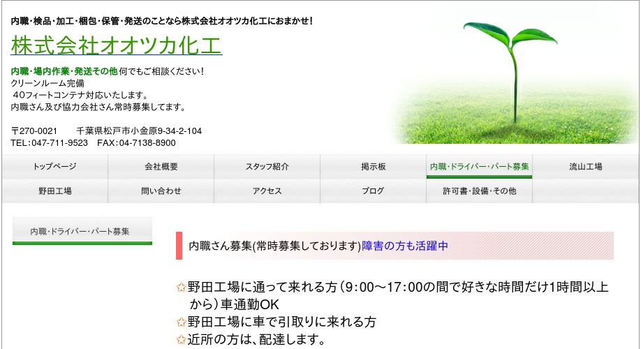 公式サイトへ「株式会社オオツカ化工」の内職について、ホームページの記載内容から、オススメできそうか(安心できそうか)を在宅ワークガイド・スタッフが独自にチェックしました。(2015年12月4日チェック)