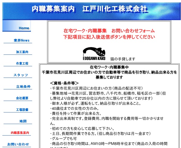 公式サイトへ「江戸川化工株式会社」の内職について、ホームページの記載内容から、オススメできそうか(安心できそうか)を在宅ワークガイド・スタッフが独自にチェックしました。(2015年12月28日チェック)