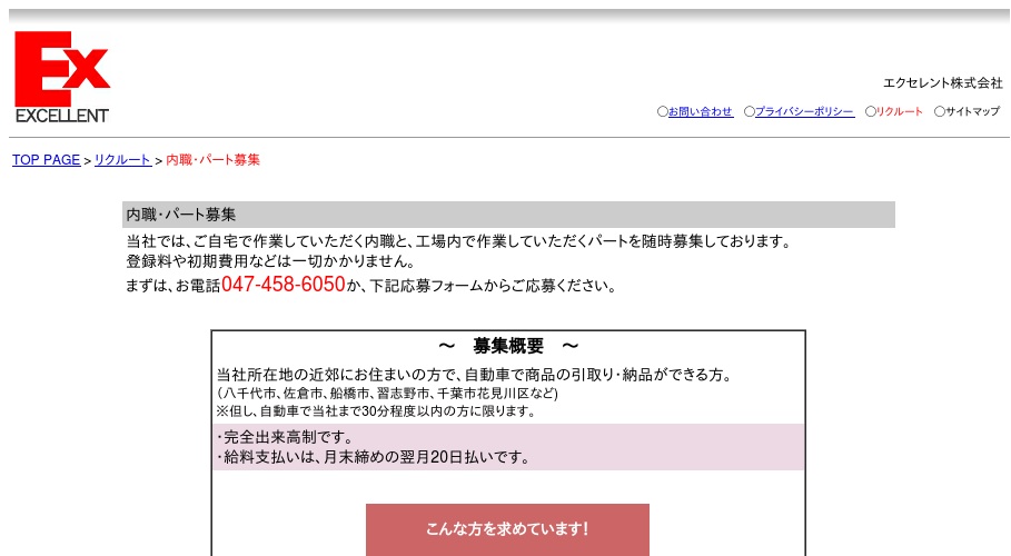 公式サイトへ「エクセレント株式会社」の内職について、ホームページの記載内容から、オススメできそうか(安心できそうか)を在宅ワークガイド・スタッフが独自にチェックしました。(2015年12月28日チェック)