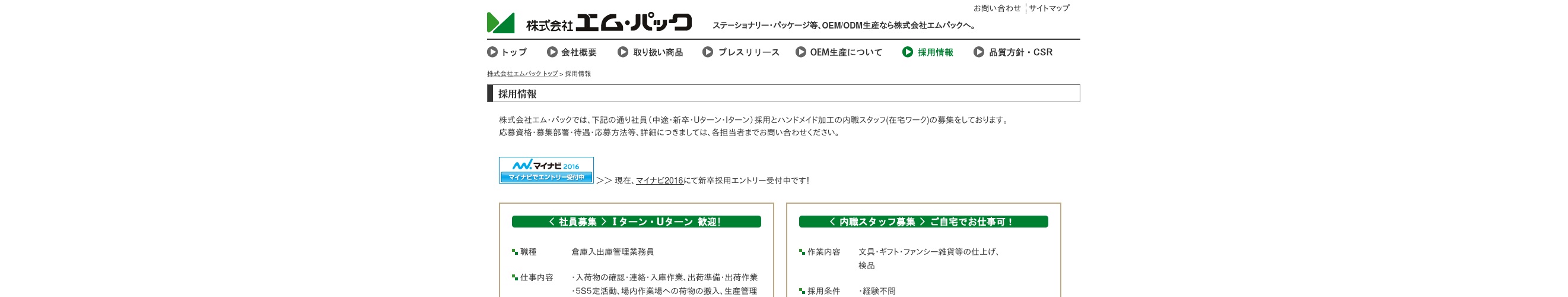 公式サイトへ「株式会社 エム・パック」の内職について、ホームページの記載内容から、オススメできそうか(安心できそうか)を在宅ワークガイド・スタッフが独自にチェックしました。(2016年1月18日チェック)