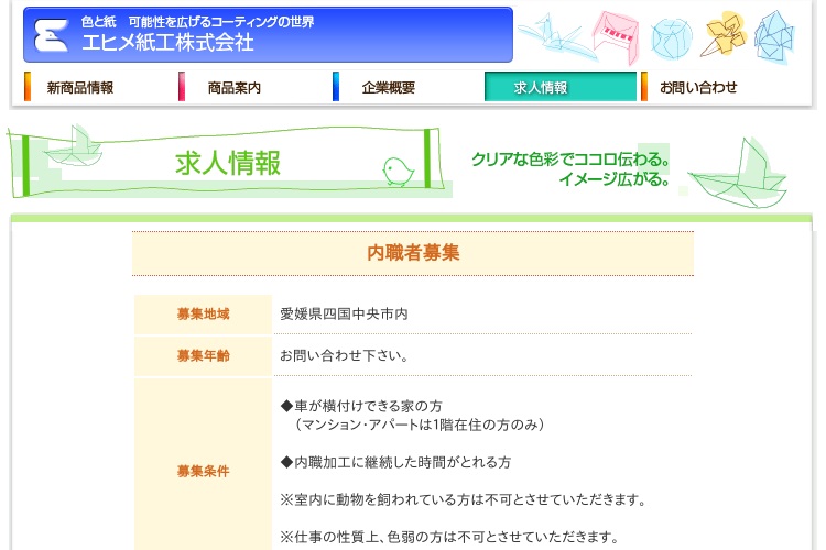 公式サイトへ「エヒメ紙工株式会社」の内職について、ホームページの記載内容から、オススメできそうか(安心できそうか)を在宅ワークガイド・スタッフが独自にチェックしました。(2016年1月18日チェック)