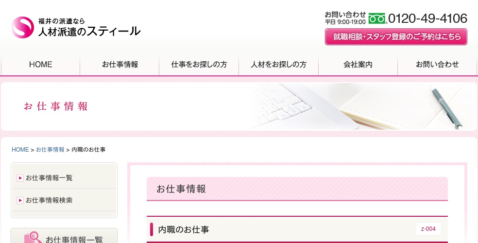 人材派遣業を主に行っている会社になります。登録制で工場内の仕事や接客・配膳から機械オペレーターまで様々な職種の人材派遣を行っています。福井市内でシール貼りや組み立てなどの内職作業者の募集をしているようです。詳細については掲載されていないので電話かメールで確認してください。