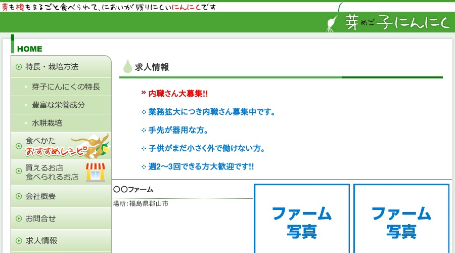 郡山市で水耕栽培で芽子にんにくを栽培・加工し販売している会社になります。週2?3回から仕事が可能で手先の器用な方を募集しています。詳細についてはホームページに掲載されていないので直接確認してください。