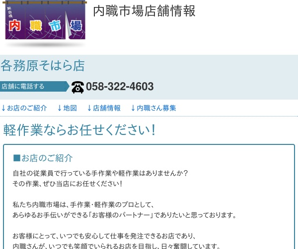 公式サイトへ「内職市場 各務原そはら店」の内職について、ホームページの記載内容から、オススメできそうか(安心できそうか)を在宅ワークガイド・スタッフが独自にチェックしました。(2016年1月10日チェック)