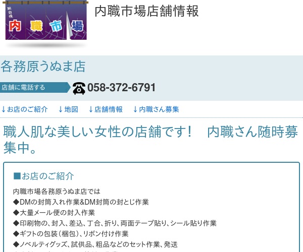 内職作業全般を全国展開している内職市場の各務原うぬま店になります。作業内容はダイレクトメールの封筒入れやメール便の封入作業、シール貼りなど手作業全般となっています。女性の方が多く働いている職場のようで毎週水曜13時から説明会が開かれているようです。説明会できちんと話を聞くことができ疑問なども直接担当者の方に相談できるので納得して仕事をすることができそうです。