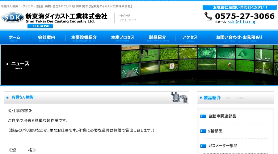 公式サイトへ「新東海ダイカスト工業株式会社」の内職について、ホームページの記載内容から、オススメできそうか(安心できそうか)を在宅ワークガイド・スタッフが独自にチェックしました。(2016年1月18日チェック)