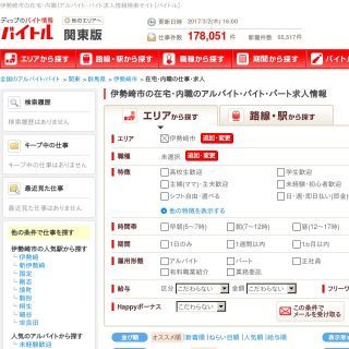 広告やコラム、ノウハウや特集などがない「indeed」では、シンプルにお仕事の情報だけが入手できます。本業で忙しい方、伊勢崎市でどんなお仕事が見つかるのかちょっと見てみたい方、とにかくすぐにお仕事情報が知りたい方におすすめの求人サイトです。伊勢崎市で見つかるお仕事は、洋服のリフォーム・リメイク、美容・サプリ・アンケートモニター、コラム記事、保健指導・特定保健指導員、占いカウンセラー、建物診断士、放送受信料契約・収納業務、家庭教師、営業、ヤクルトスタッフ、ポスティングスタッフなど、さまざまな職種のお仕事が探せますよ。