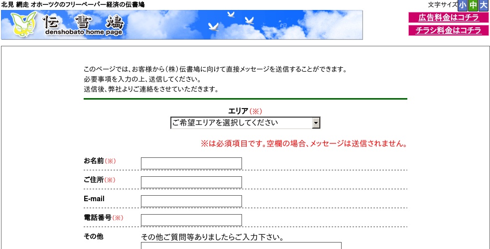 北海道北見市に本社のある日刊情報誌「経済の伝書鳩」の制作・発行やチラシ宣伝物の部分および全戸宅配などを行っている会社になります。網走支店では網走市緑町、網走市台町1丁目、網走市呼人、網走市駒場南4丁目エリアでの紙面宅配員を募集しています。詳しいことは掲載されていないので問い合わせが必要になっています。