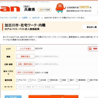 こちらも求人サイトの情報をまとめて検索できるサイトです。indeedと同じくキーワードと勤務地を入力するだけで検索が出来るので手軽ですよ。ページも見やすく目的のお仕事を見つけやすいです。加古川市では「アンケートモニター」、「ミステリーショッパー」、「美容モニター」の募集があります。また、キーワードを委託にすると「特定保健指導員」のお仕事も見つかります。その他にも勤務地を在宅にすると居住地を問わないお仕事が数千件出てきます。ぜひ色々と検索を試してみて下さいね。