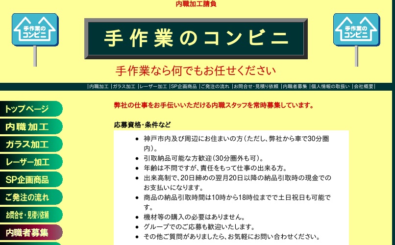 神戸市にあるギフト商品や記念品の企画製造販売などを行っている会社です。仕事内容は各種包装や袋詰め作業、各種箱組など手作業全般となっています。会社から車で30分圏内の神戸市内およびその周辺にお住まいの方を対象にしていますが、本人による引き取り納品が可能であれば30分圏外も応募が可能です。グループでの仕事も可能なので気の合った仲間と一緒に仕事をすることもできます。