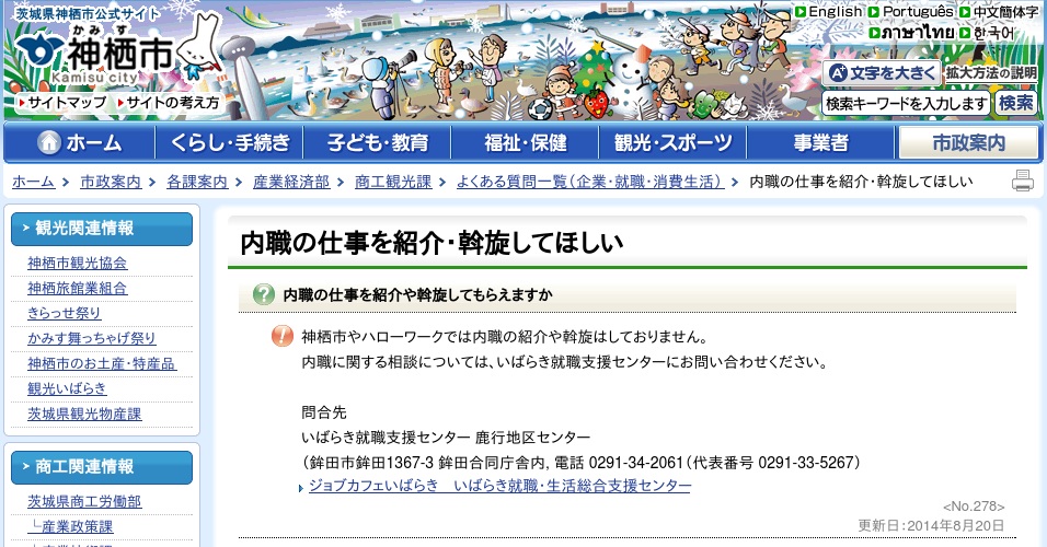 神栖市の公式サイトになります。神栖市ではハローワークなどを始め内職に関する窓口はないので鉾田市にある「いばらき就職支援センター鹿行地区センター」へ問い合わせる必要があります。電話での問い合わせも可能なので利用してみてください。