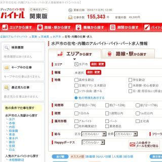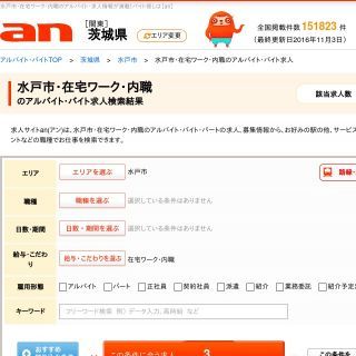 有名なアンのサイトですね。在宅ワークを探す場合はエリアを選んで給与・こだわりの欄で「在宅ワーク・内職」を選ぶと簡単です。水戸市では「WEBモニター」、「美容系の覆面調査」、「美容モニター」の仕事があります。気になった仕事があれば「とりあえず保存」ボタンを押しておくと、あとからまとめて見られます。このサイトでは応募も1分で済ませられるので便利ですね。雇用形態や日数・期間など検索条件が細かく設定できるので、こだわりの強い方はぜひこのサイトを利用してみて下さい。