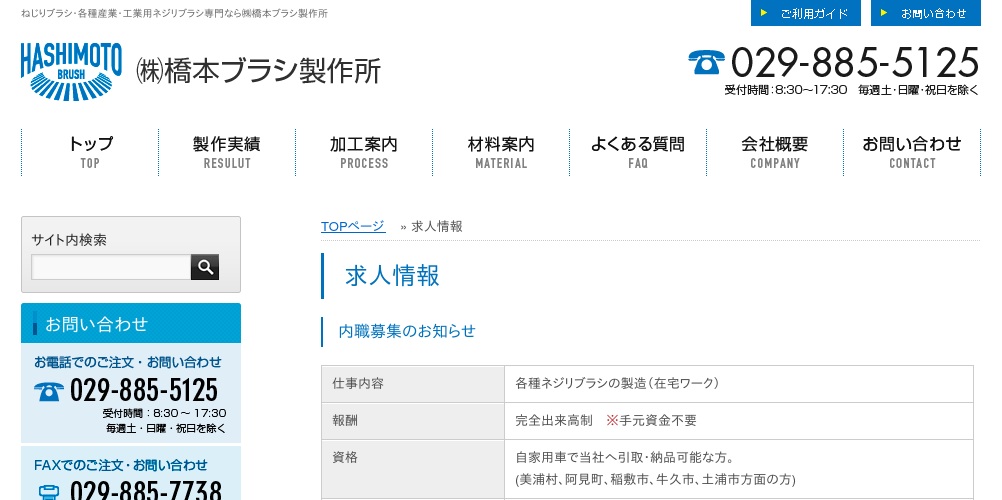 公式サイトへ「株式会社 橋本ブラシ製作所」の内職について、ホームページの記載内容から、オススメできそうか(安心できそうか)を在宅ワークガイド・スタッフが独自にチェックしました。(2016年1月16日チェック)