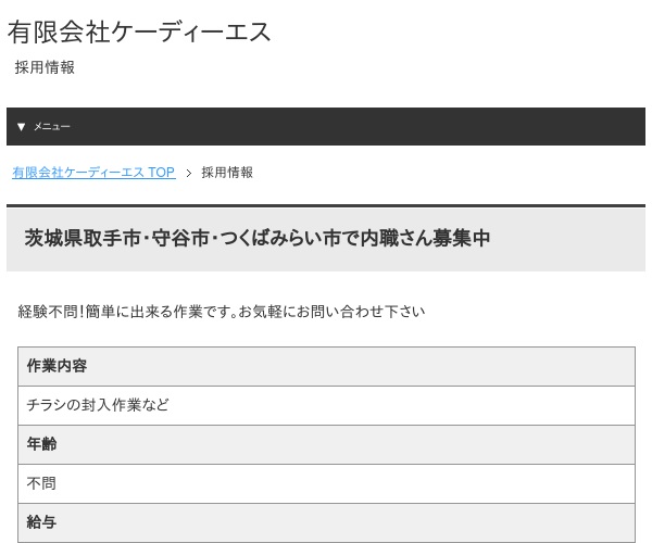 公式サイトへ「有限会社 ケーディーエス」の内職について、ホームページの記載内容から、オススメできそうか(安心できそうか)を在宅ワークガイド・スタッフが独自にチェックしました。(2016年1月18日チェック)