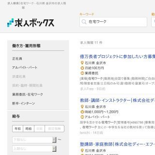 こちらも求人サイトの情報をまとめて検索できるサイトです。スッキリとしたデザインで見やすく、欲しい情報だけが目立つようになっています。金沢市では「オンライン家庭教師」、「特定保健指導員」の仕事があります。また、勤務地に在宅ワークと入れると「出品業務」、「記事作成」、「4コマ漫画製作」など居住地にこだわらない仕事が7000件弱出てきます。ユニークな仕事が多いのでぜひ一度目を通してみて下さい。除外キーワードなどを設定できる詳細検索を使うとより仕事を探しやすくなりますよ。