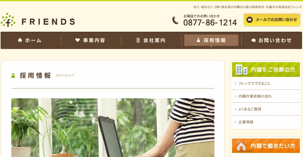 公式サイトへ「有限会社フレンズ」の内職について、ホームページの記載内容から、オススメできそうか(安心できそうか)を在宅ワークガイド・スタッフが独自にチェックしました。(2016年1月16日チェック)