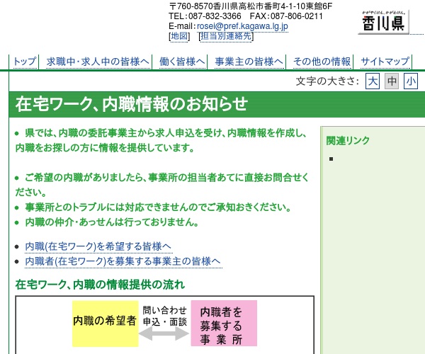 香川県商工労働部労働政策課の公式サイトに掲載されている在宅ワーク、内職情報のお知らせのページになります。香川県では県内の求人情報をこちらのページで公開しています。地域別に掲載されているので探しやすいページになっていると思います。坂出市の情報は「坂出地区」から閲覧が可能です。希望する内職を見つけた場合は直接事業所に問い合わせをする必要があります。