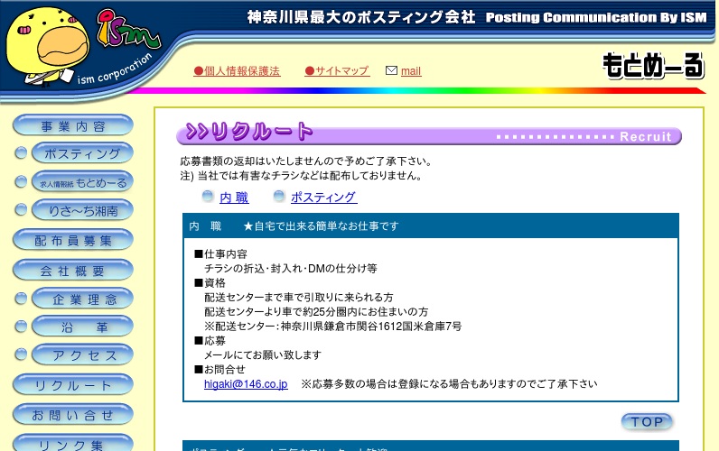 本社が神奈川県藤沢市にある神奈川県最大のポスティング会社になります。鎌倉市にある配送センターまで自家用車で25分圏内の方を対象に募集しています。仕事内容はチラシの折り込み・封入れ・ダイレクトメールの仕分けなど比較的簡単な作業となっているので初めて内職を行う方にも始めやすいと思います。