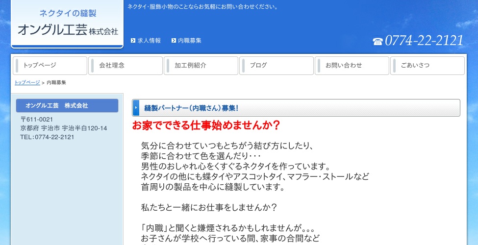 公式サイトへ「オングル工芸株式会社」の内職について、ホームページの記載内容から、オススメできそうか(安心できそうか)を在宅ワークガイド・スタッフが独自にチェックしました。(2016年1月16日チェック)