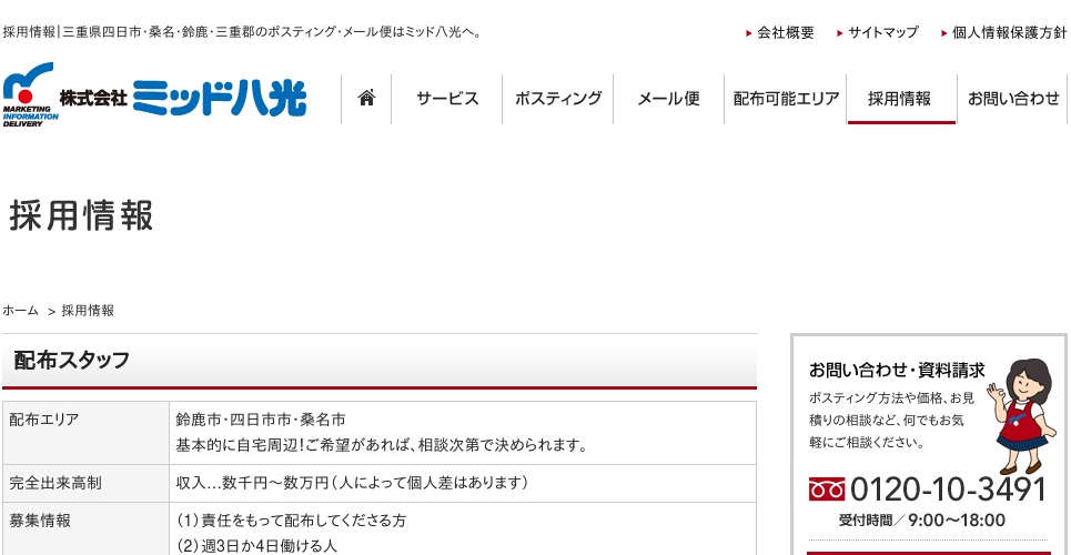 三重県三重郡菰野町にあるチラシやダイレクトメールのポスティング作業や封入・封滅、郵便物の仕分けなどの内職作業などを行っている会社になります。桑名市にお住まいの方を対象に自宅周辺、または希望するエリアでの配布スタッフを募集しています。70歳くらいまでの方を対象に募集しています。配布するチラシは自宅に届くため出社する必要がないのも特徴です。