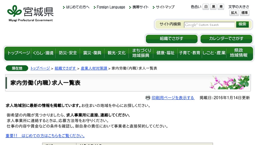宮城県の公式サイトに掲載されている家内労働(内職)求人一覧表のページになります。宮城県ではこちらのサイトで県内の内職求人情報を閲覧することが出来ます。地域別に掲載されているのでとても探しやすいページになっていると思います。白石市の求人情報は「大河原」地域から閲覧が可能になっています。