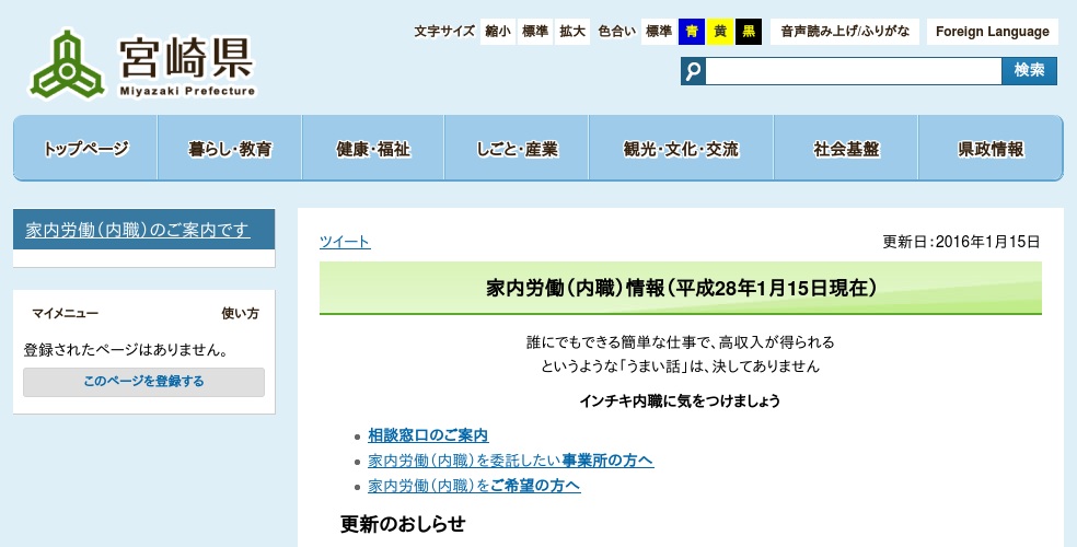 宮崎県の公式ホームページになります。宮崎県では県内の内職求人情報をページ上で公開しています。地区別に閲覧が出来るので探しやすいページになっていると思います。高岡町の情報は「宮崎・東諸・西都・児湯地区」から閲覧が可能です。応募の際には地域雇用対策室発行の紹介状が必要なので宮崎県労働政策課地域雇用対策室へ問い合わせを行ってください。