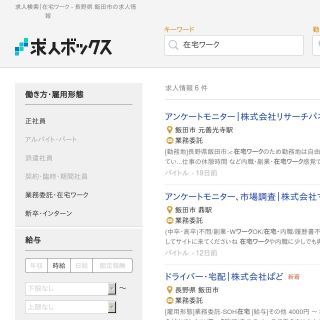 求人ボックスは細かい条件設定やよけいなメニューがなく、文字も大きめでシンプルで見やすいのが特徴のサイト。飯田市の在宅ワークの求人情報は「アンケートモニター」「Webプログラマ」など6件探すことができます。求人ボックスのもう一つの特徴は、働き方の絞り込み項目で在宅ワーク(・業務委託)の選択が可能なところ。あらかじめこの在宅ワークで絞り込んでおけば、希望の職種やお仕事内容の在宅ワーク求人も探しやすくなります。ただし、実際には在宅ワークでも求人情報の雇用形態が正社員などに設定されていると検索対象外になりますので注意してくださいね。