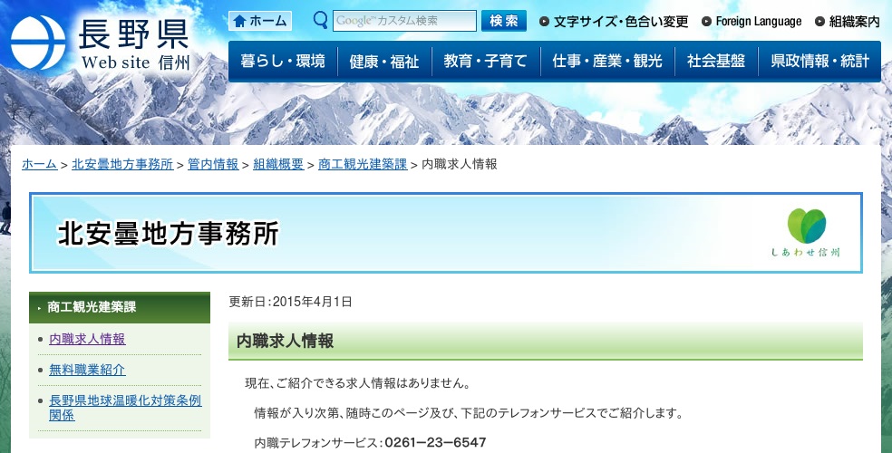 長野県の公式ホームページの北安曇地方事務所のページになります。大町市にある北安曇地方事務所では小谷村を含む北安曇地方の内職求人情報をホームページと電話案内で地域にお住まいの方に向けて提供しています。時期によっては求人情報がない場合もあり、その場合は入り次第公開されるようです。小谷村で内職を希望される方はこちらのページをこまめにチェックしてみてください。