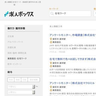 こちらも求人サイトの情報をまとめて検索できます。諫早市では「特定保健指導員」、「アンケートモニター」などの在宅ワークがあります。キーワードと勤務地を入力するだけでその条件の求人情報が出てくるので手軽に検索ができます。関連、日付、給与順に並び替えが可能なので、自分が見やすい順に並び替えるといいでしょう。検索したキーワードに合ったスポンサーのリンクも表示されるので、そちらも併せてチェックしてみて下さい。