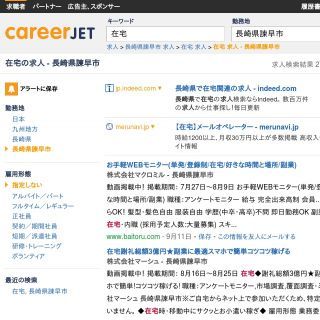 求人サイトの情報をまとめて検索できるサイトです。諫早市内では見つかりませんでしたが、検索範囲を25㎞以内にすると「オンライン家庭教師」、「アンケートモニター」の在宅ワークがあります。このように距離で検索範囲を広げていけるのが特徴で、この他にも検索オプションで除外キーワードを設定出来たり、掲載期間で絞り込みが出来たりと便利な機能が沢山あります。最近検索した条件で新着情報があると左側で表示してくれるので分かりやすいです。ぜひ一度使って見て欲しいサイトです。