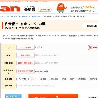 こちらもネット上の求人情報をまとめて検索できるサイトです。佐世保市では「特定保健指導員」、「アンケートモニター」の仕事があります。勤務地とフリーワードを入力するだけで結果が表示され、検索が簡単です。検索結果もシンプルに表示されながら、重要なところは分かりやすいので見やすいですよ。また、勤務地の欄に「在宅ワーク」と入れると、全国どこからでも応募が可能な在宅ワークの求人情報が得られるので、ぜひそちらも検索してみて下さい。