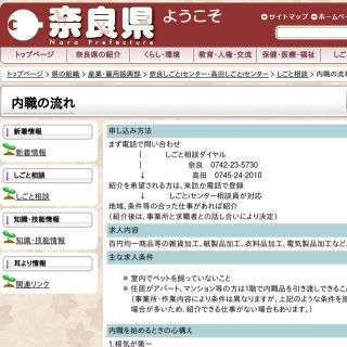 奈良県の公式ホームページになります。奈良県ではインターネットでの求人情報閲覧は行っていませんが、電話か来訪での内職に関する相談ダイヤルと内職情報の提供を行っています。直接相談員と話す機会があるので自分の希望や内職に関する疑問などを相談することができると思います。 -