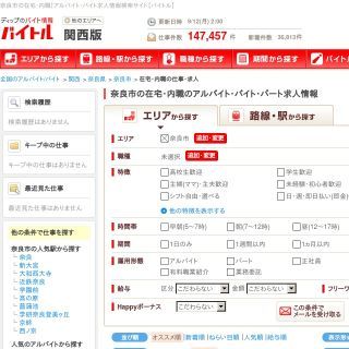 価格.comで有名な株式会社カカクコムが運営する求人サイトです。奈良市では「メール対応」、「在宅講師」、「アンケートモニター」などの在宅ワークがあります。シンプルな画面設定なので見やすく、分かりやすいです。また、検索時の細かい条件設定が必要なく、勤務地とキーワードを入力するだけでいい簡単さが魅力です。一覧表示が出て来てから詳細検索が出来るので、おおまかに検索したい方にも細かく条件指定したいかたにもおすすめのサイトです。