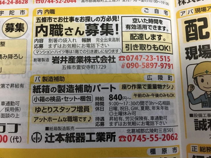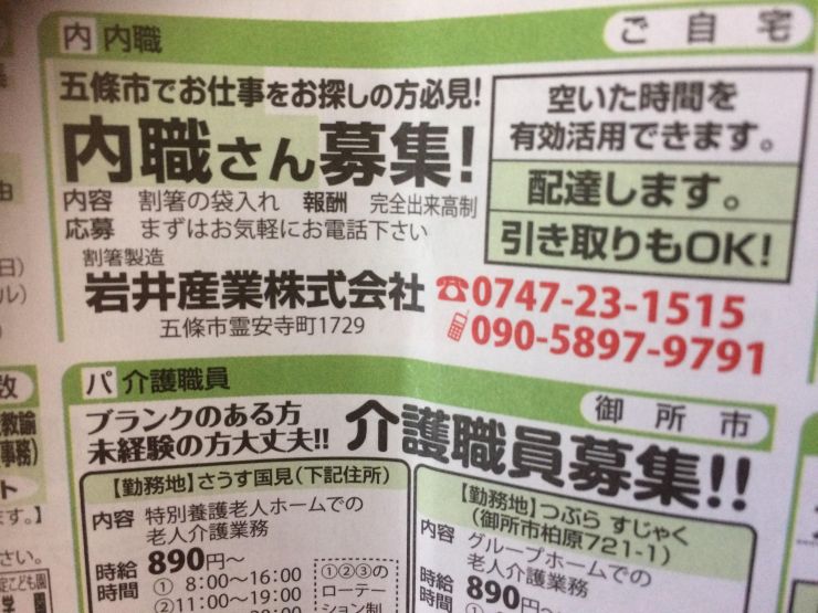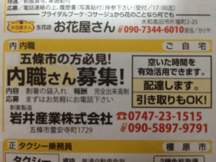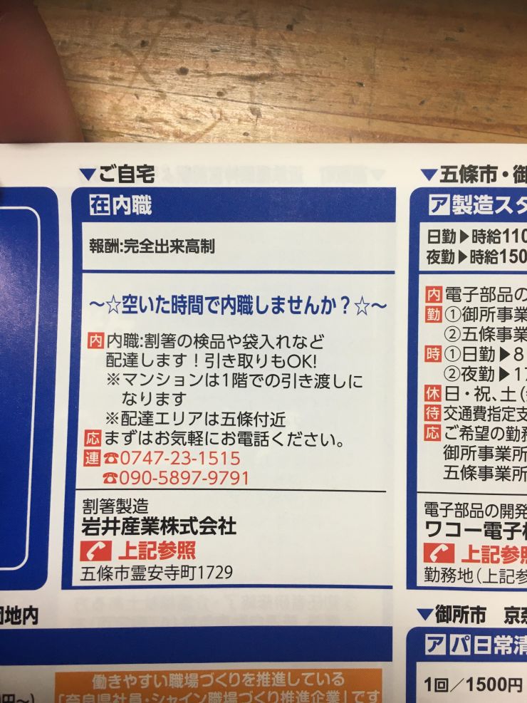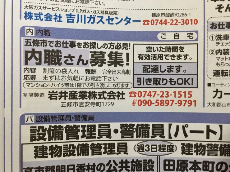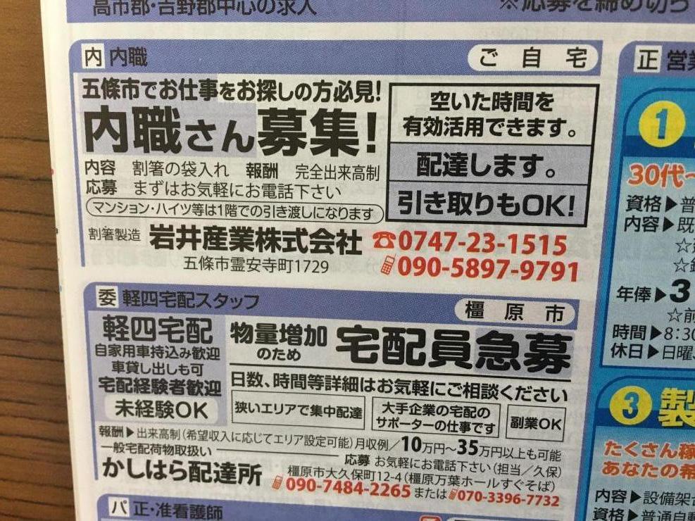 五條市の方必見と記されているので、五條市に住んでいる方にオススメできます。割箸の袋入れという作業、報酬は完全出来高制ですのでこういったことをコツコツこなせる方に向いています。まずはお気軽にお電話下さい。