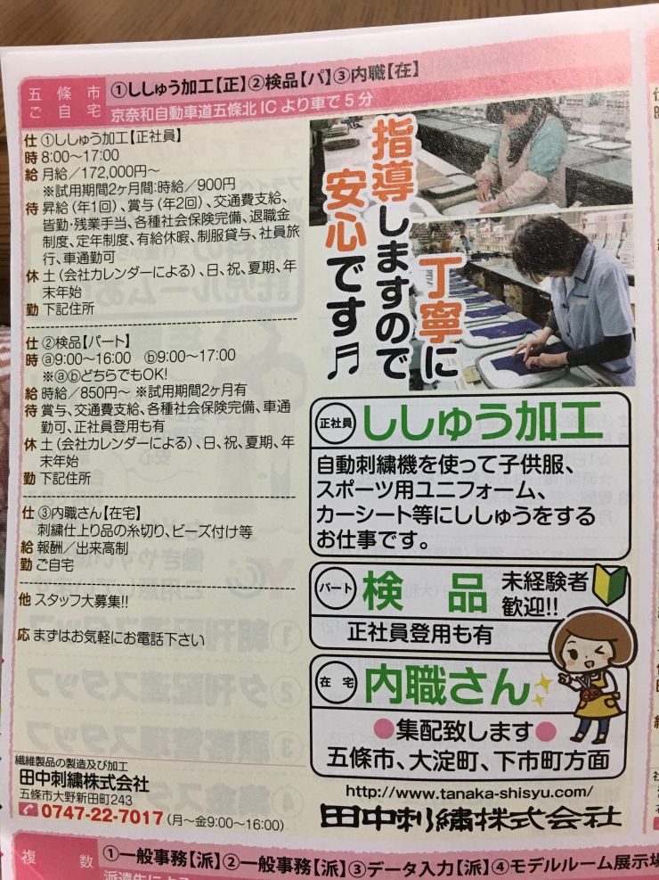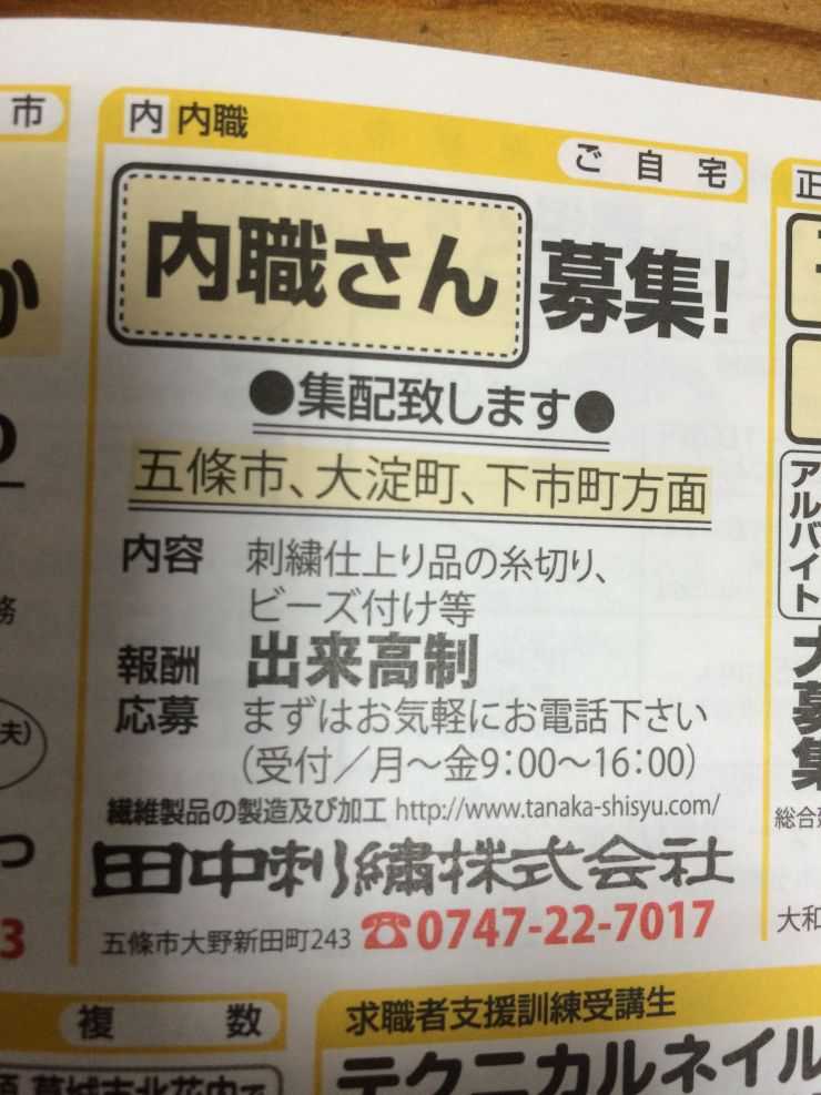 刺繍仕上がり品の糸切り、ビーズ付け等の在宅内職の求人です。五條市、大淀町、下市町方面は集配があります。