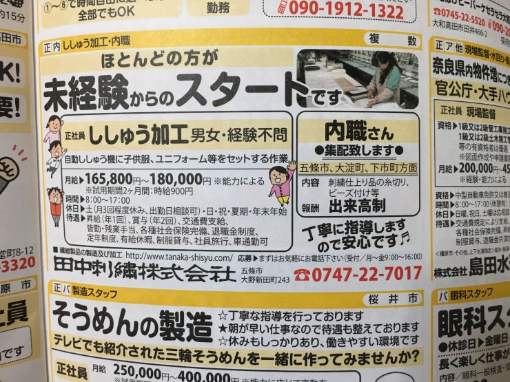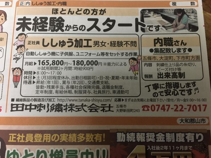 丁寧な指導がありますので、安心して仕事が始められます。五條市、大淀町、下市町方面は会社からの集配がありますから、こちらにお住まいの方にオススメです。報酬は出来高制となっています。まずはお気軽にお電話下さい。